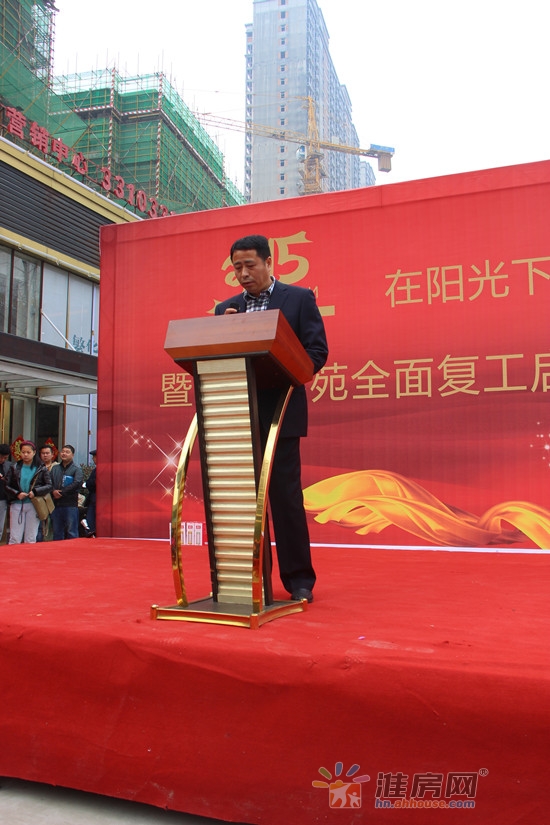 2017年3月12日上午,位于淮南市國慶西路上的金恒雅苑小區(qū)舉行復(fù)工大典,并開始向市民銷售。作為該小區(qū)的承建單位,我公司總技術(shù)負(fù)責(zé)人、總經(jīng)理?xiàng)钣烂魍镜桥_講話。